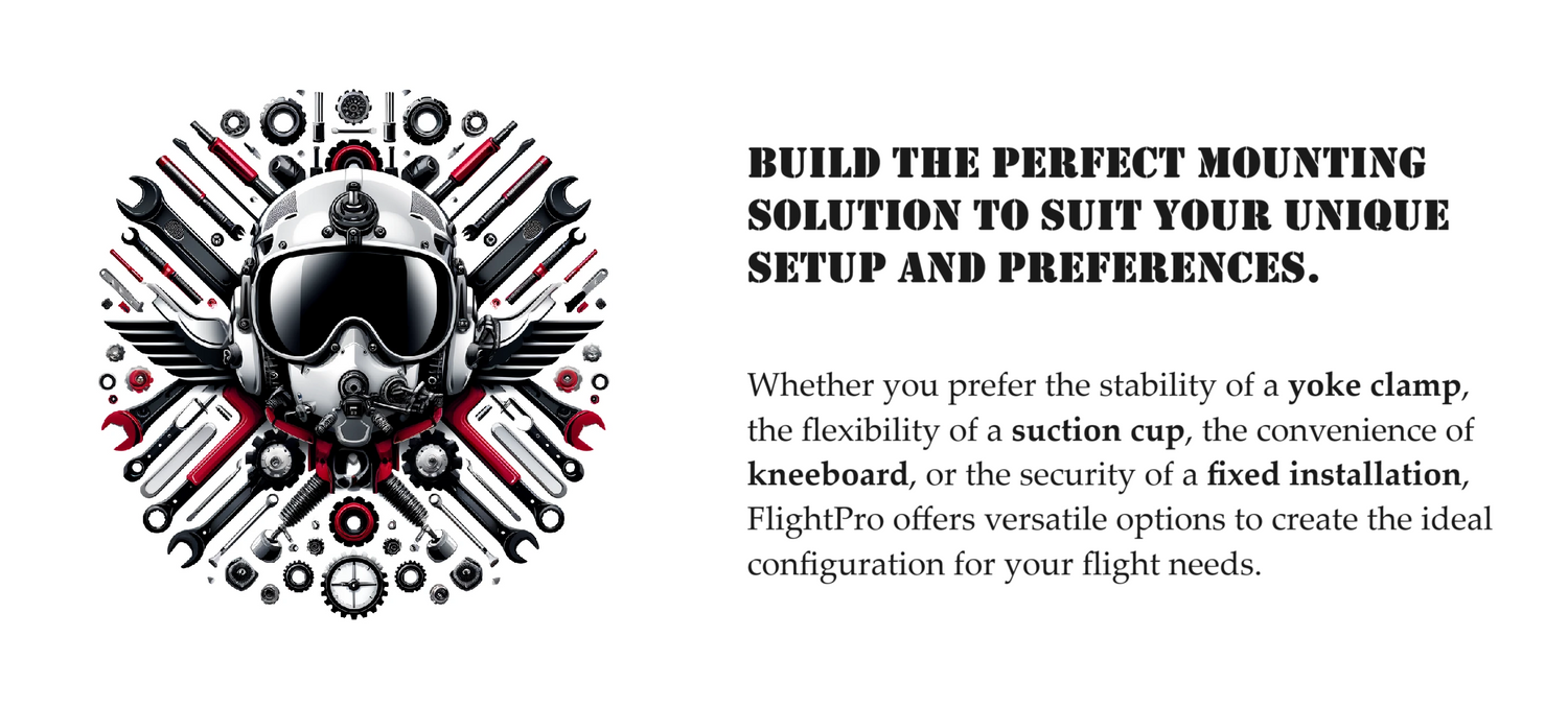 Choose the mounting option that suits your needs: Yoke Clamp for secure attachment to a control yoke, Suction Cup Mount for flexible positioning on smooth surfaces, Kneeboard for convenient lap use, Fixed Plate for permanent installation, or select multiple options for versatility.