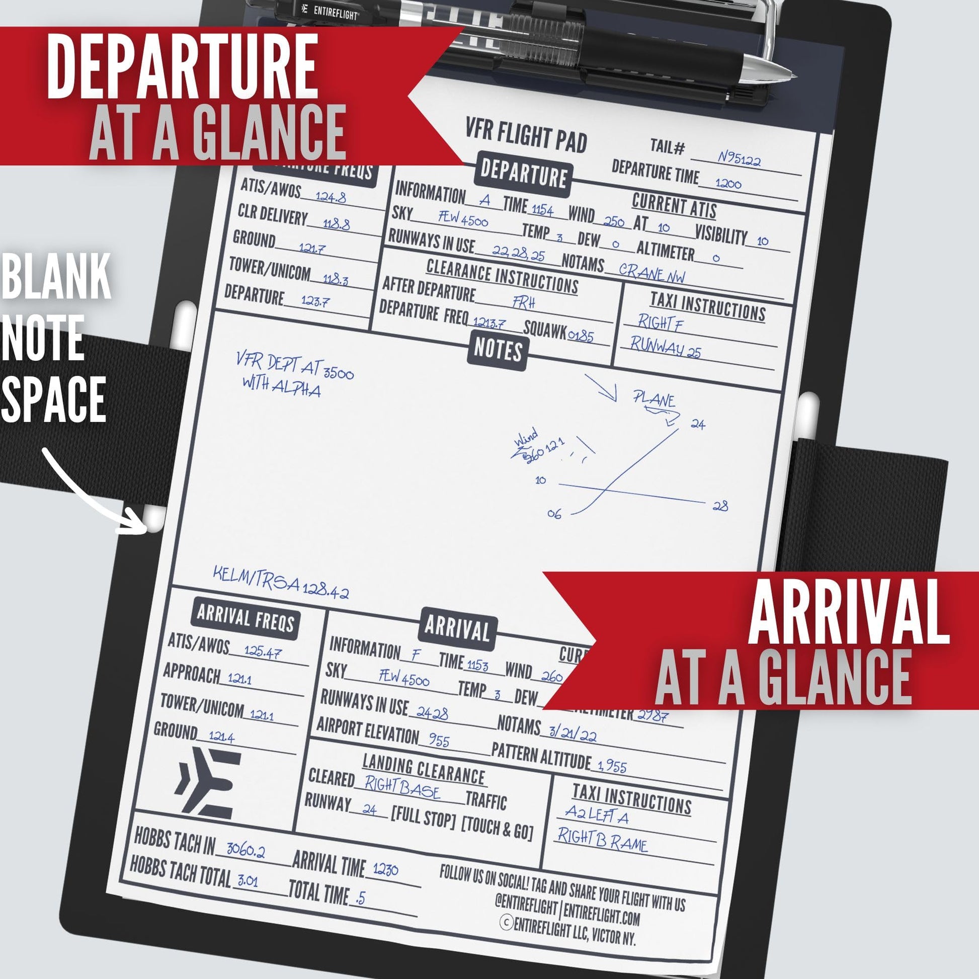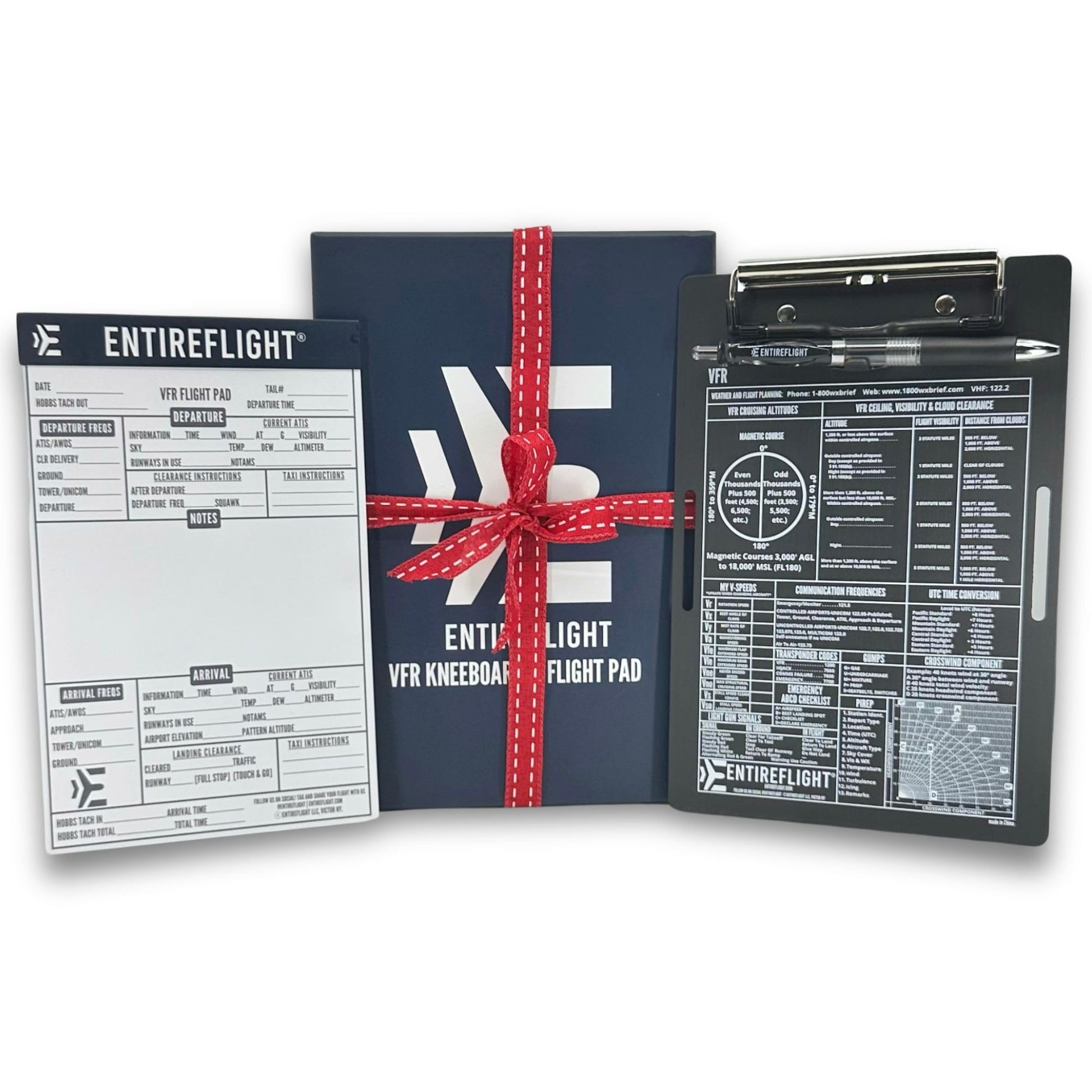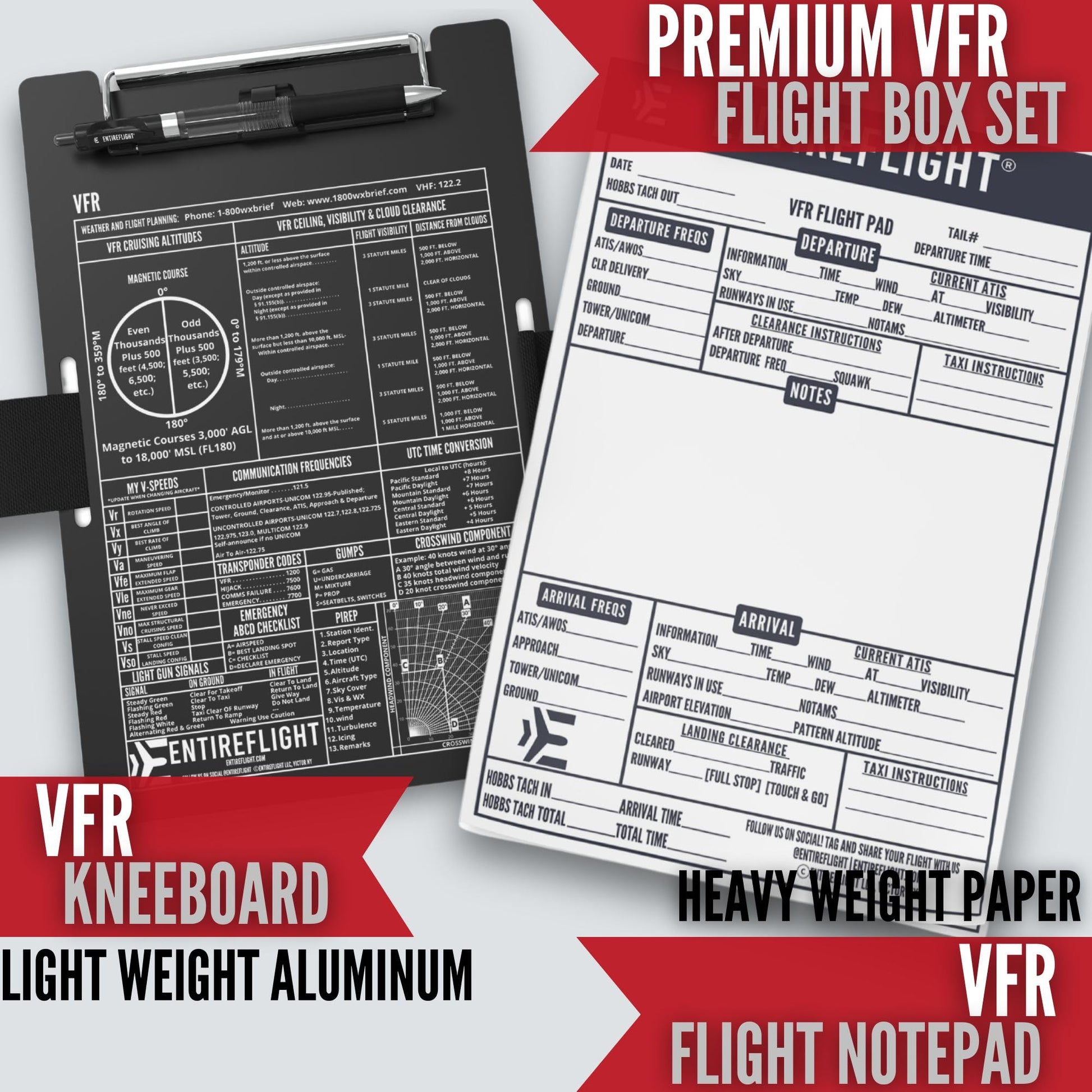 Details: Experience streamlined note-taking with the EntireFlight VFR Kneeboard and note-pad set. The perfect private pilot kit or accessory for any pilot, this set includes a black EntireFlight VFR Kneeboard clipboard that measures 6 & 7/16 in Wide by 9 & 9/16 in tall with a pen holder and a hook and loop elastic strap for a comfortable fit. Easily store your VFR plotter or E6B flight computer between the pilot leg board and strap. The kneeboard notepad is pre-formatted with everything you need to keep track of your flight, including date, tail number, hobbs and tach times, frequencies, ATIS Clearance for departure and arrival, taxi instructions, and ample space for flight notes. The pre-printed notepad also includes designated spaces for landing clearance, runway information, and total flight time so that you can capture all essential details in one place. The pilot kneeboard has some never before seen essentials such as V-speeds where you can write in the V-speeds of your aircraft and so much more, making it the perfect kneeboard aviation accessory for all types of flights. Even if you're an ipad tablet notetaker, you still might find this product changes your mind. The EntireFlight VFR Kneeboard Gift Set is a must-have aviation kneeboard accessory and fits perfectly inside your aviation flight bag.