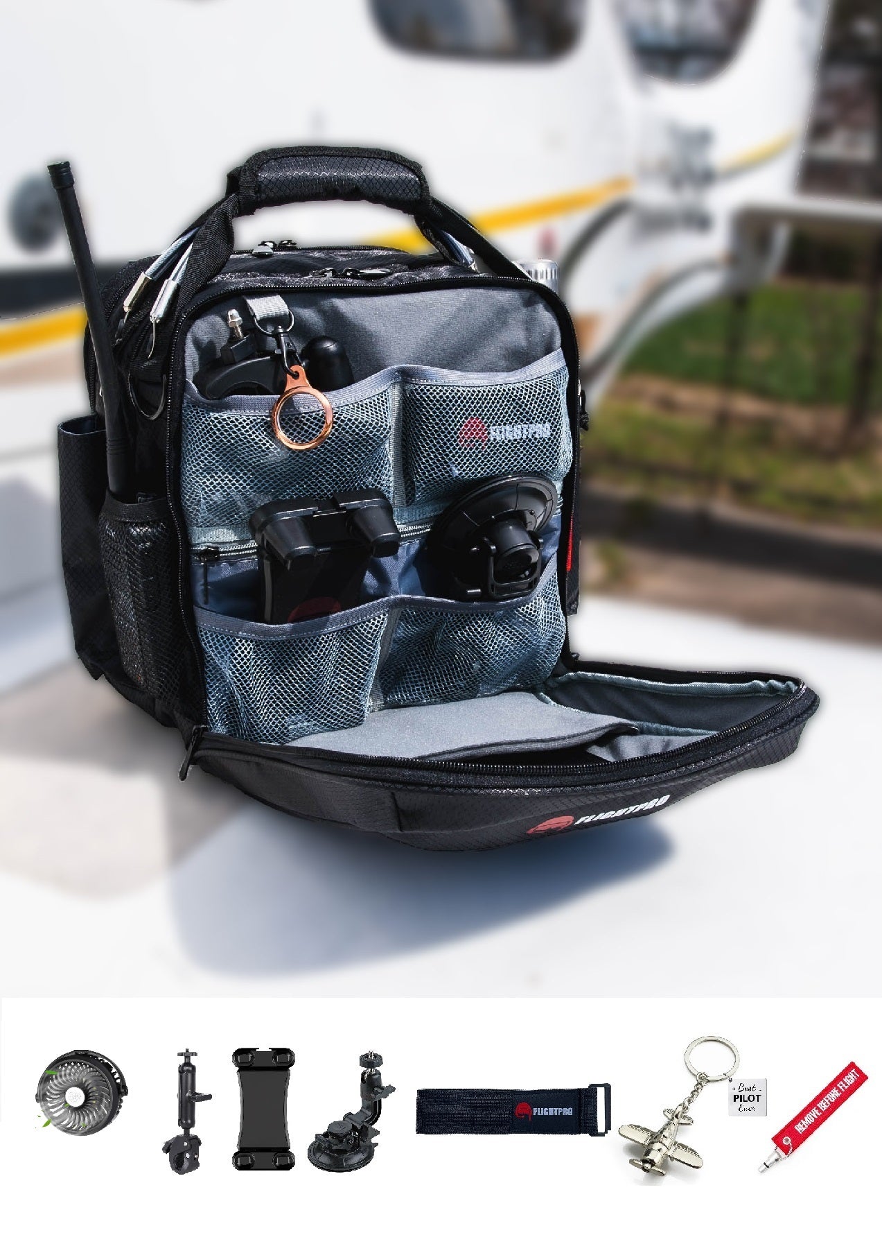 The FlightReady Pilot Pack is the ultimate gift for any aspiring aviator, offering everything a new pilot needs to soar. Thoughtfully designed for general aviation, this premium bag features dedicated pockets for essentials like headsets and radios, ensuring perfect organization. It comes pre-packed with top-notch gear, including a sturdy yoke and suction cup iPad mount, kneeboard strap, magnetic iPad cooling fan, and a fun aviation-themed keychain that proudly says "Best Pilot Ever!"